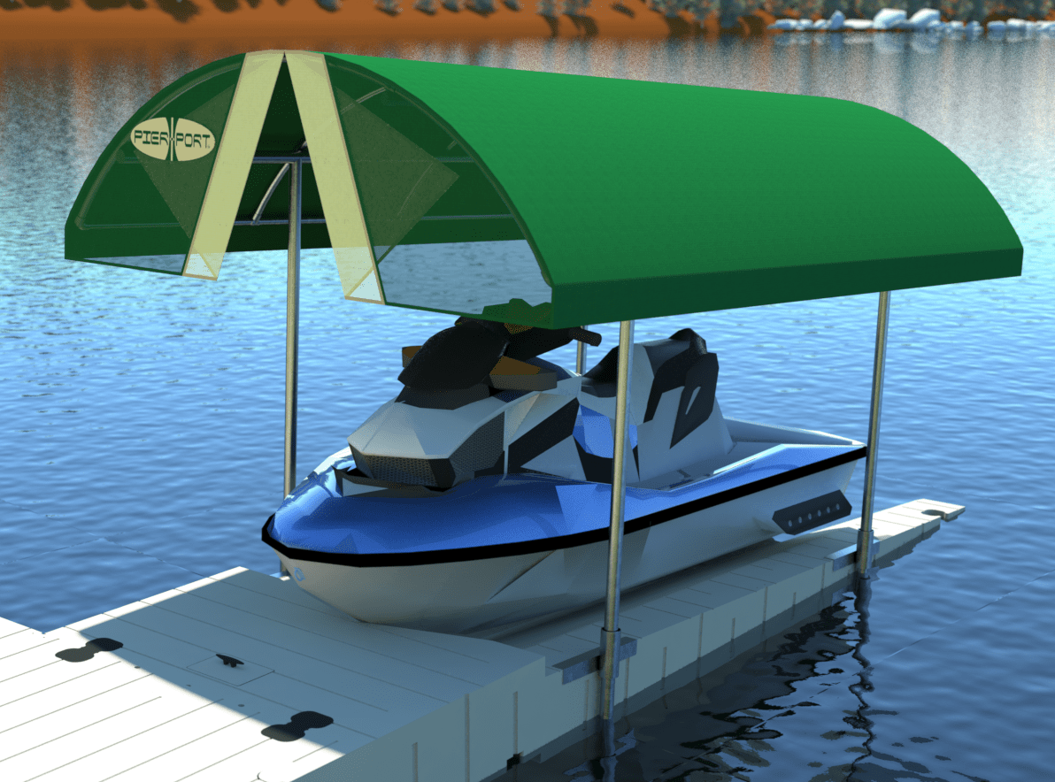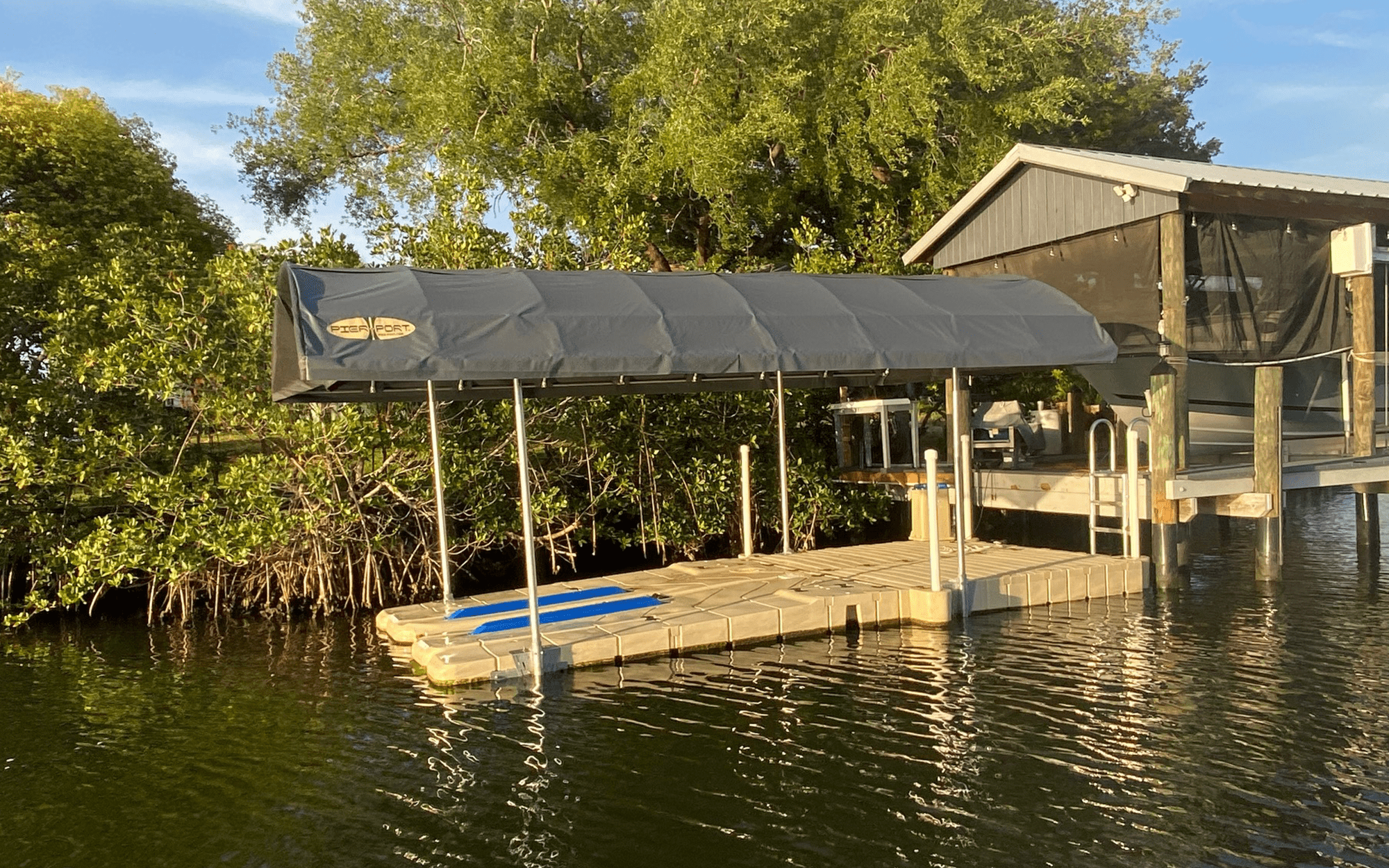 Our most compact U-shaped drive-on dock Shelter completely protects your boat from damaging UV rays and mildew-creating rain. At 7′-6″ wide, it’s ideal for drive on docks up to 7′ wide. It allows storm winds to pass through the blow-out end flaps and our patent-pending “Wind-Flo” seaming allows air to penetrate and escape without damage to the structure. No more boat covers; no moving parts; no cables to replace; no motors to maintain.