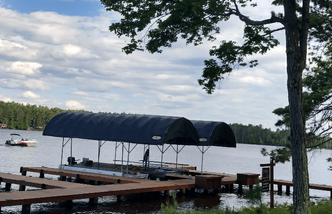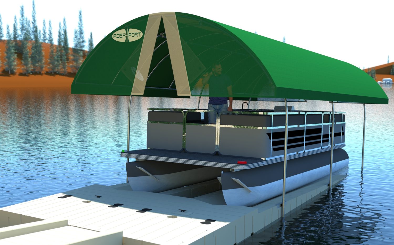 Our largest u-shaped drive-on dock shelter completely protects your boat from damaging UV rays and mildew-creating rain. At nearly 14′ wide, it’s ideal for drive on docks up to 12′ wide. The additional height and arched end mesh allow biminis, wake towers, fly bridges, etc. to pass in and out easily. Our patented “Wind-Flo” seaming allows air to penetrate and escape without damage to the structure. No more boat covers; no moving parts; no cables to replace; no motors to maintain.