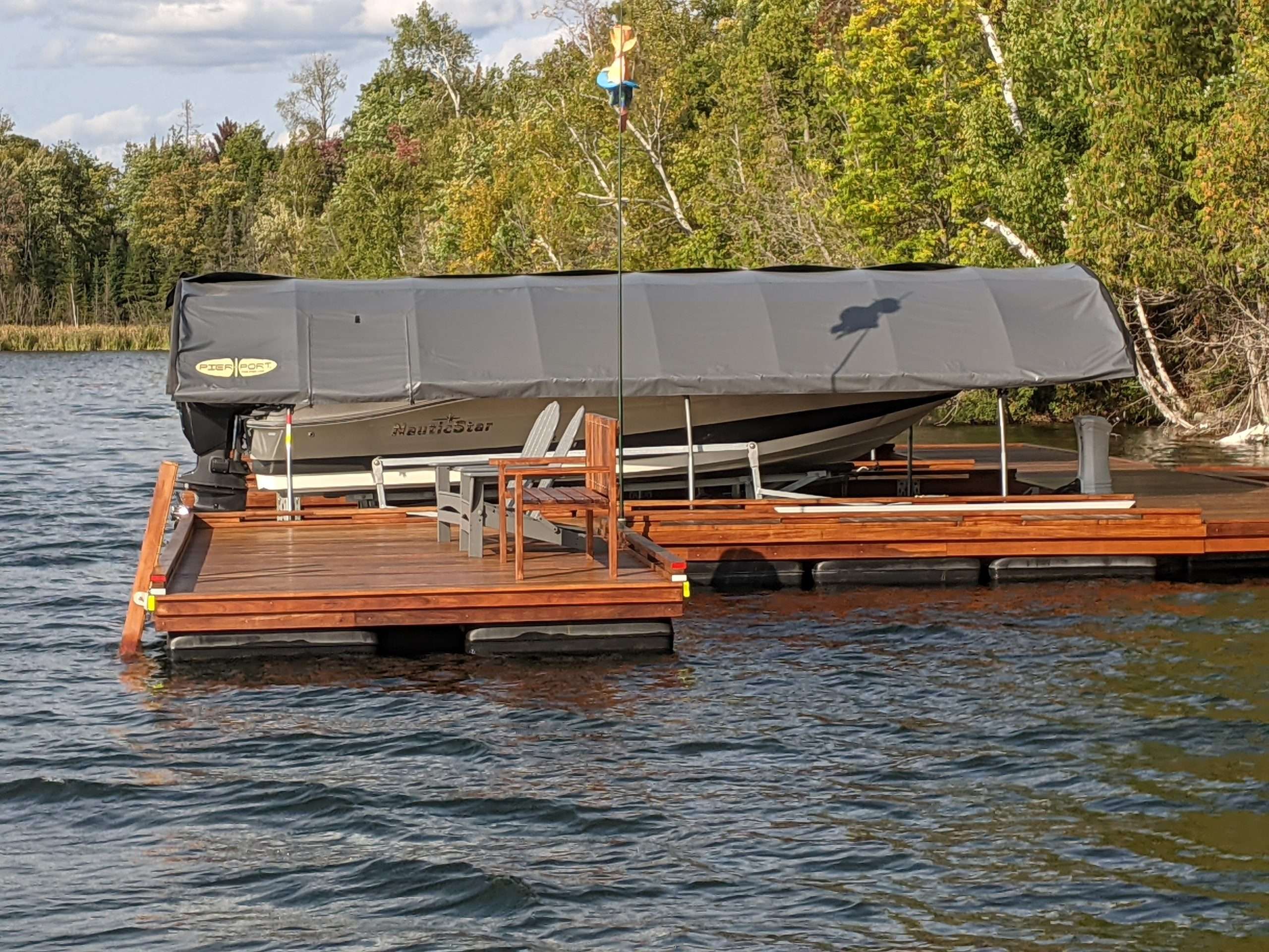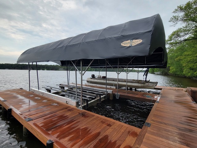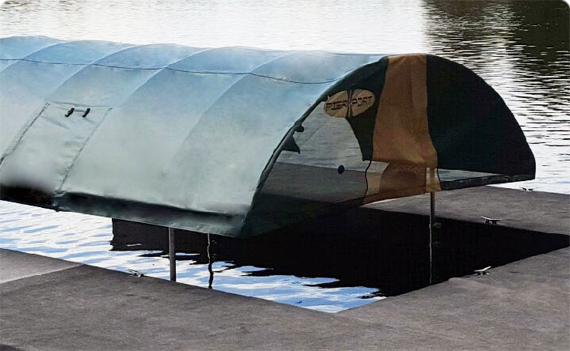 Our most popular U-shaped dock Shelter completely protects your boat from damaging UV rays and mildew-creating rain. At 12′ wide, it’s ideal for slips from 8′-12′ wide. It allows storm winds to pass through the blow-out end flaps and our patent-pending “Wind-Flo” seaming allows air to penetrate and escape without damage to the structure. No more boat covers; no moving parts; no cables to replace; no motors to maintain. The optional roll-up side doors can be located specifically to fit your boat access.